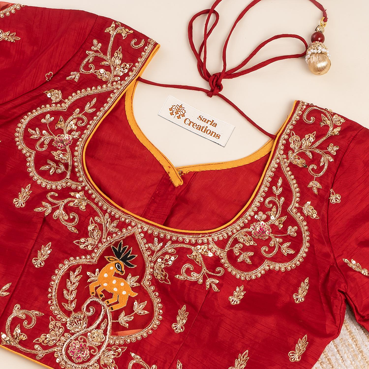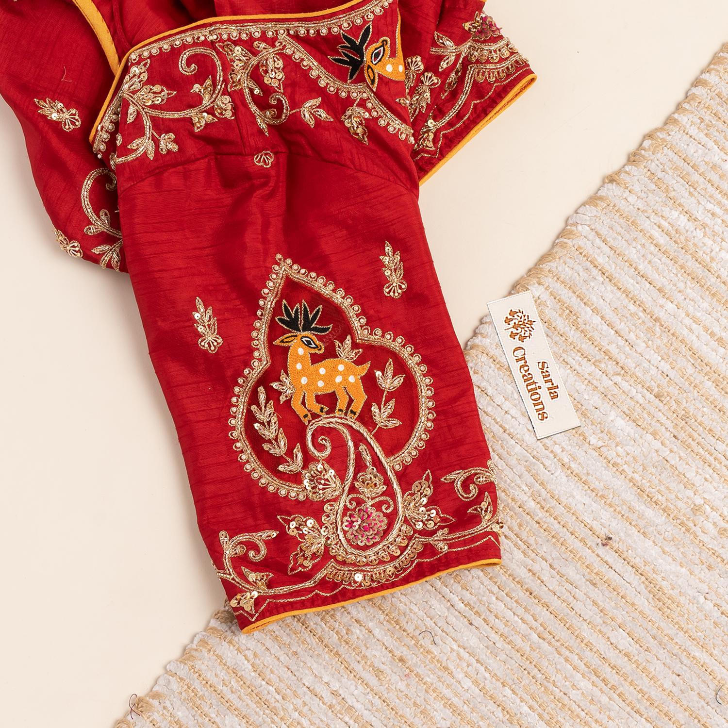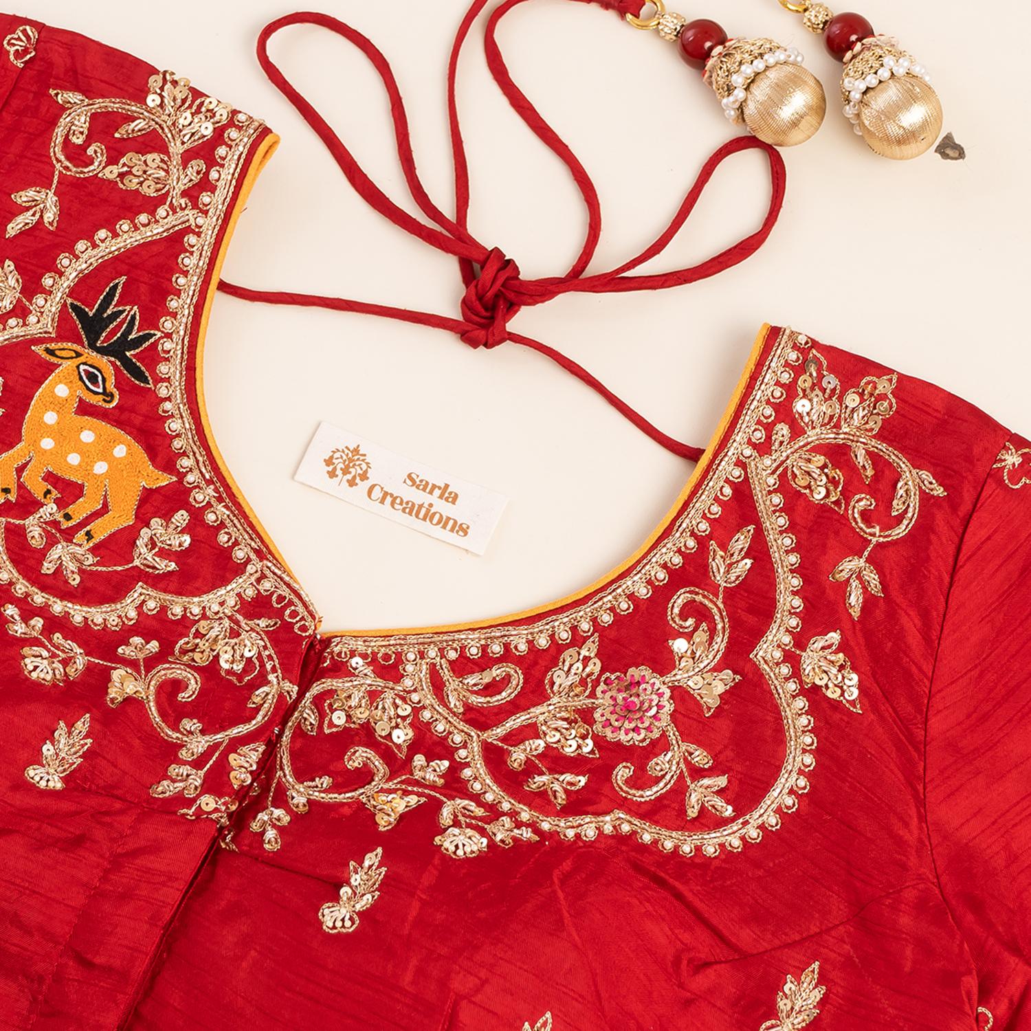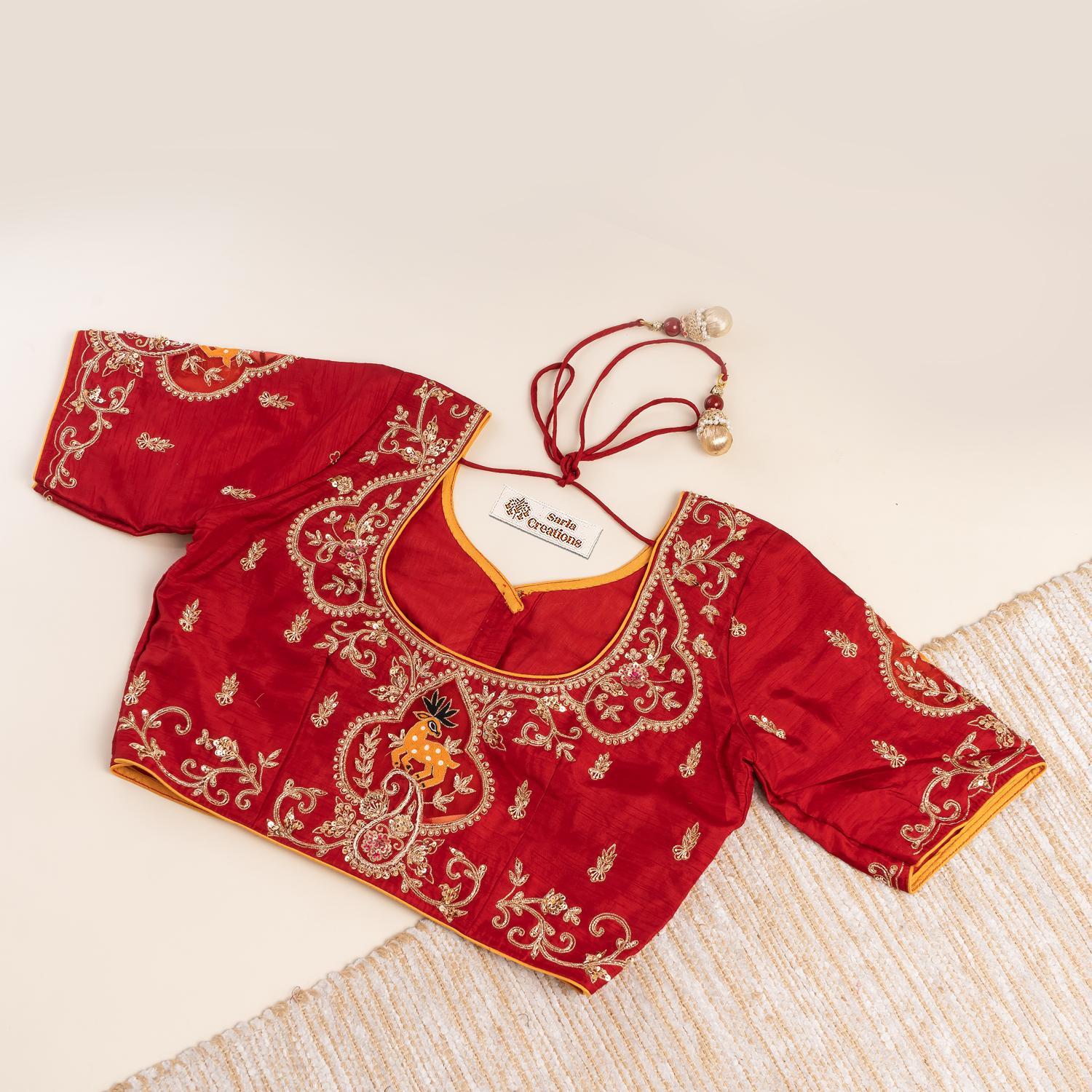 ज़रदोज़ी हस्तकला से निर्मित लाल ब्लाउज़, आकृति आकृति के साथ