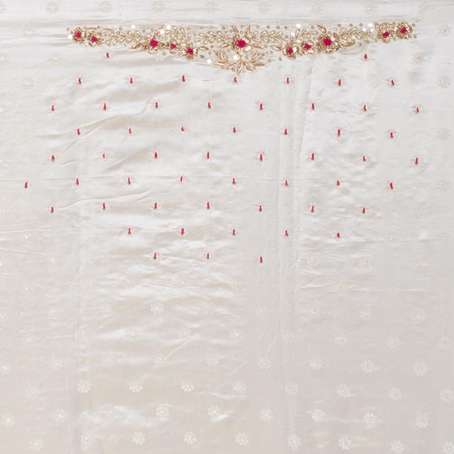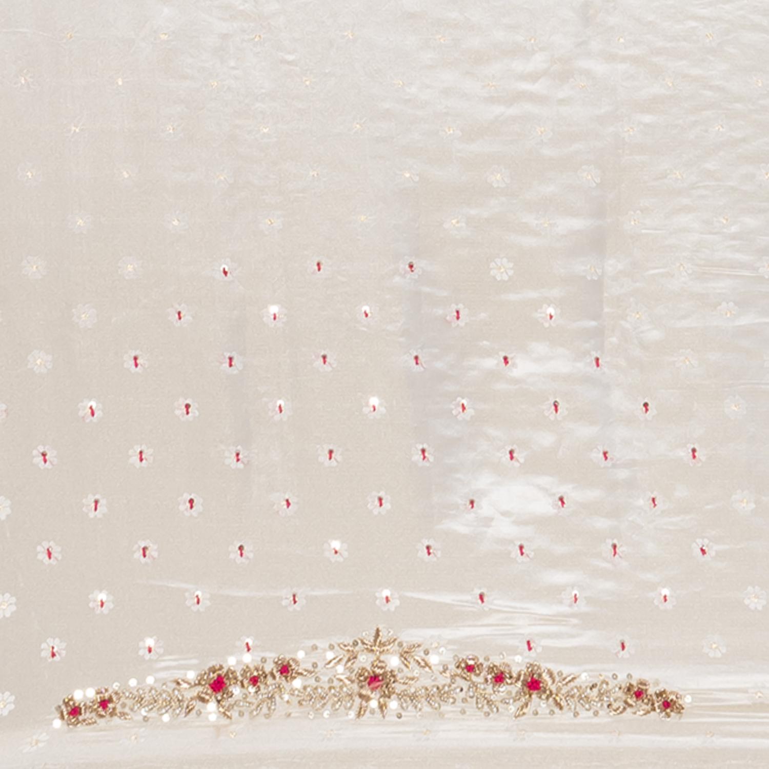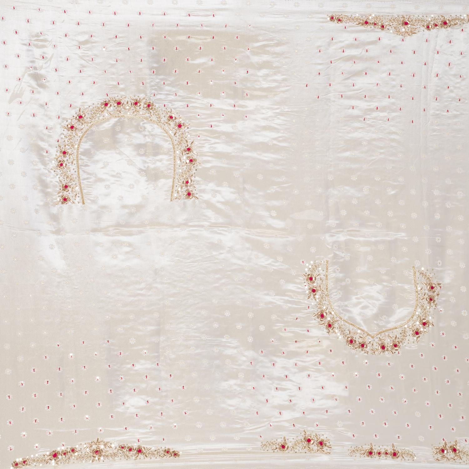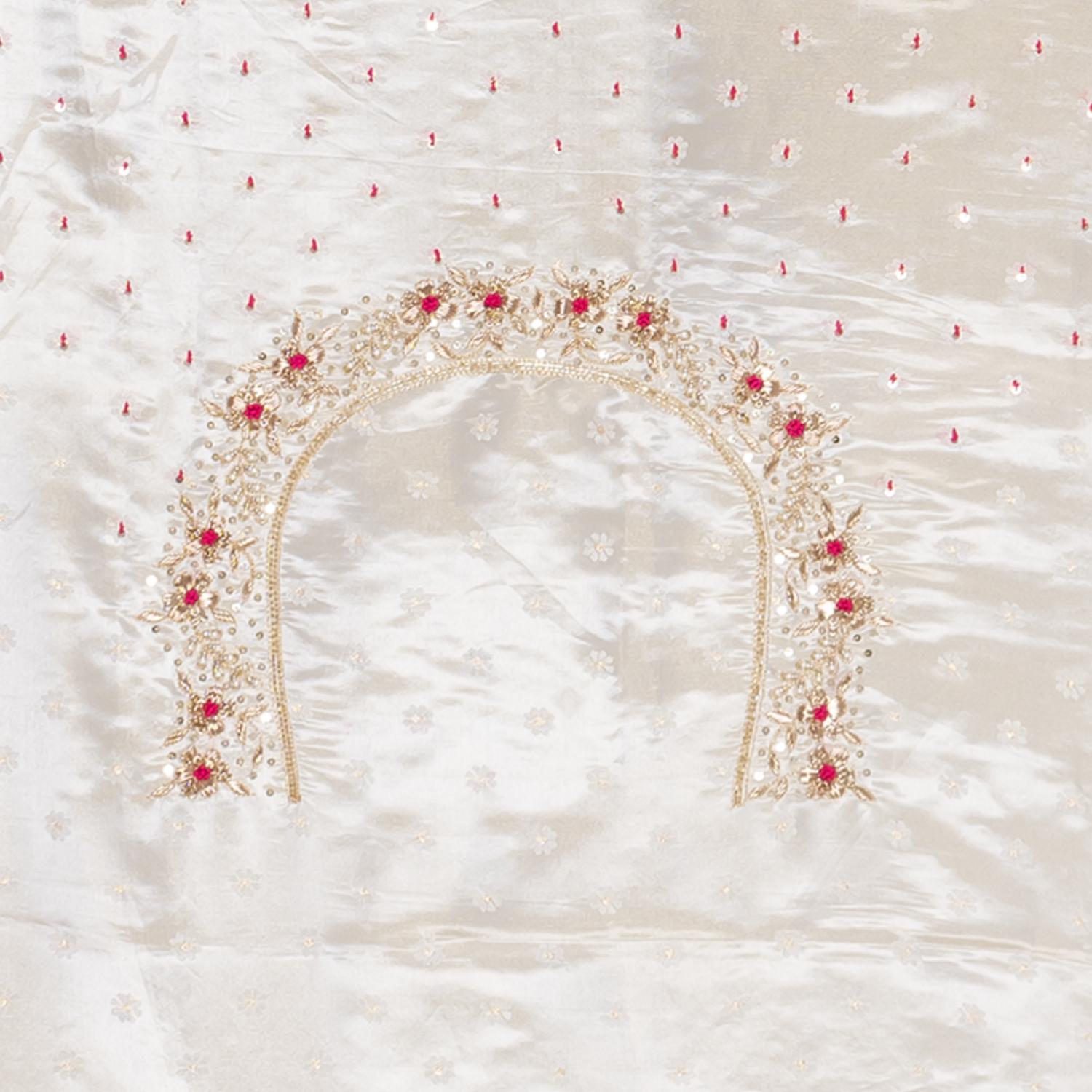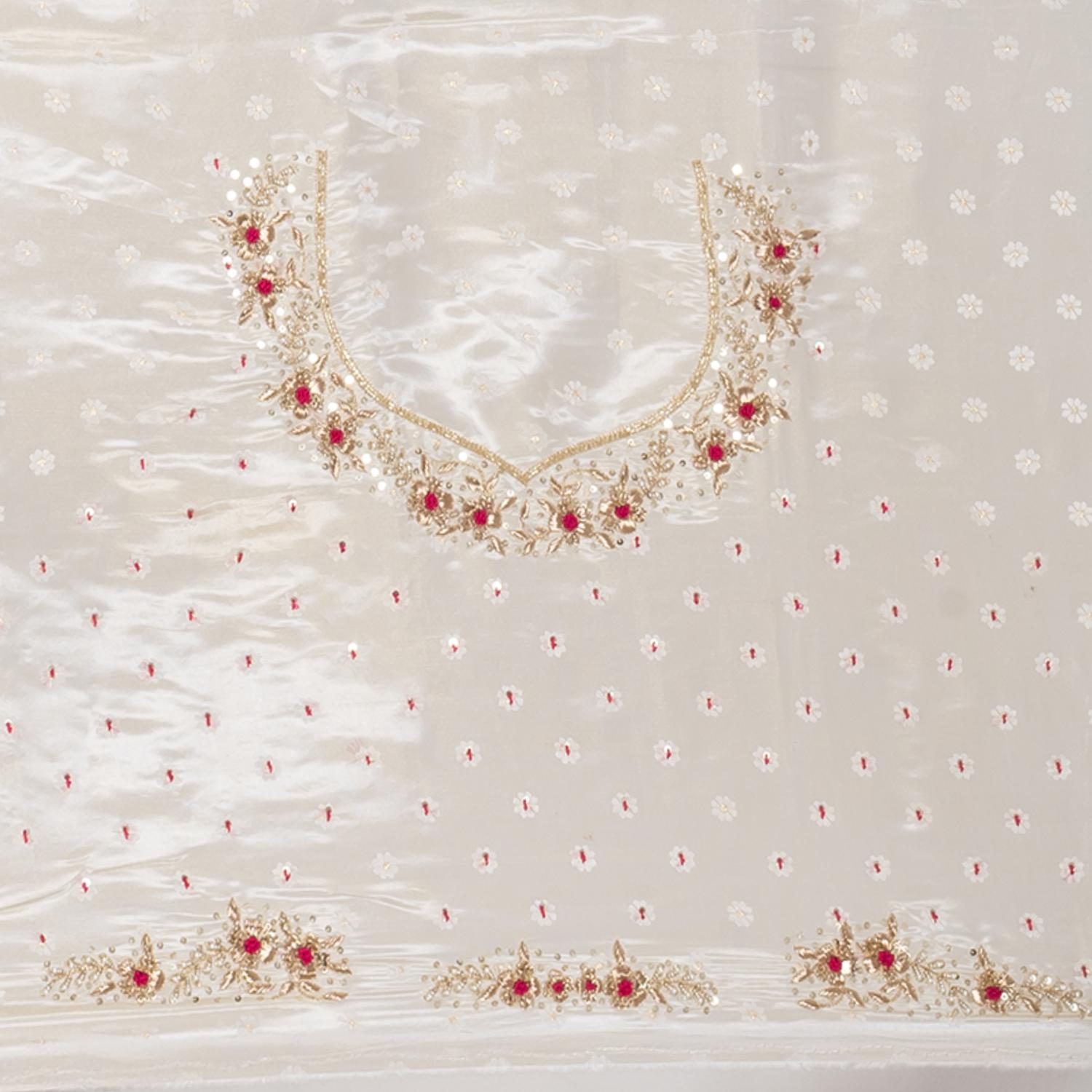 सफ़ेद रंग का टिशू सिल्क ब्लाउज पीस, जटिल ज़रदोज़ी हस्तकला और गुलाबी धागे की हाइलाइट से सुसज्जित