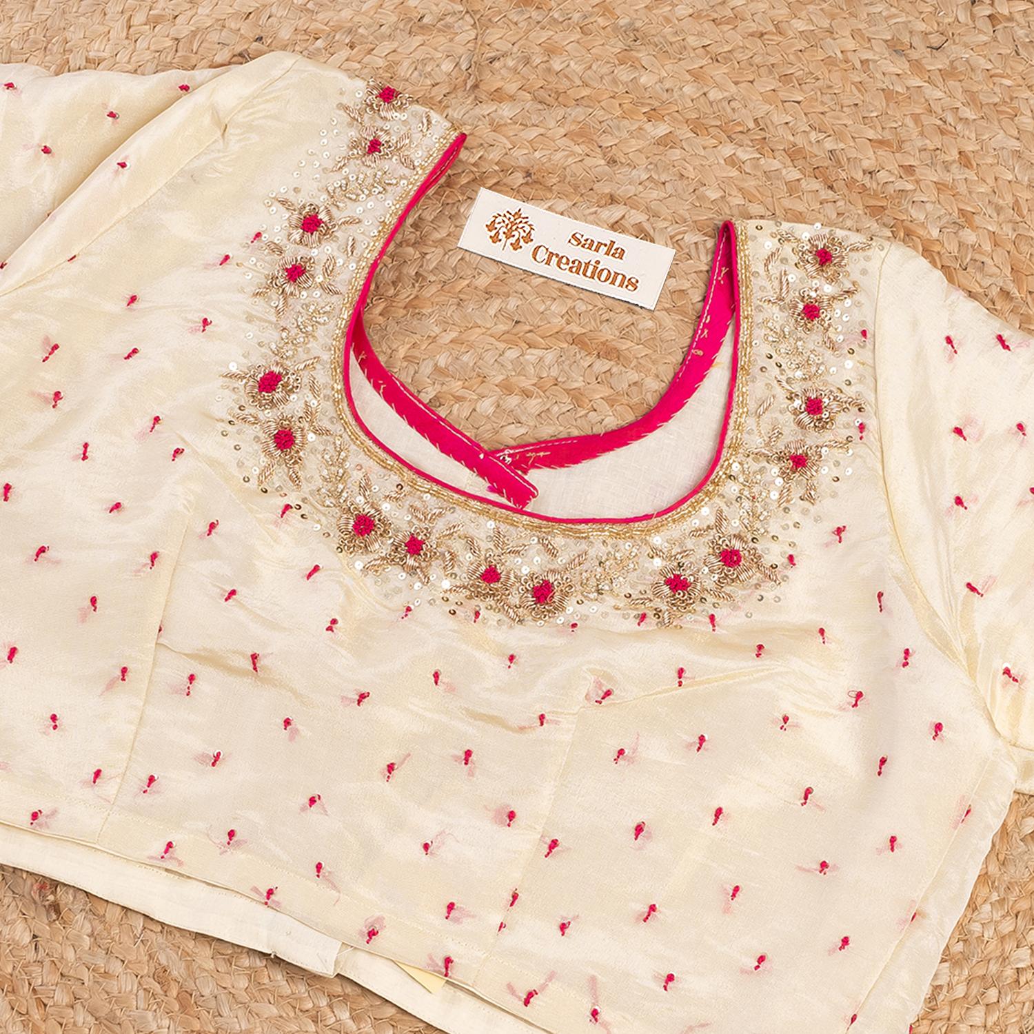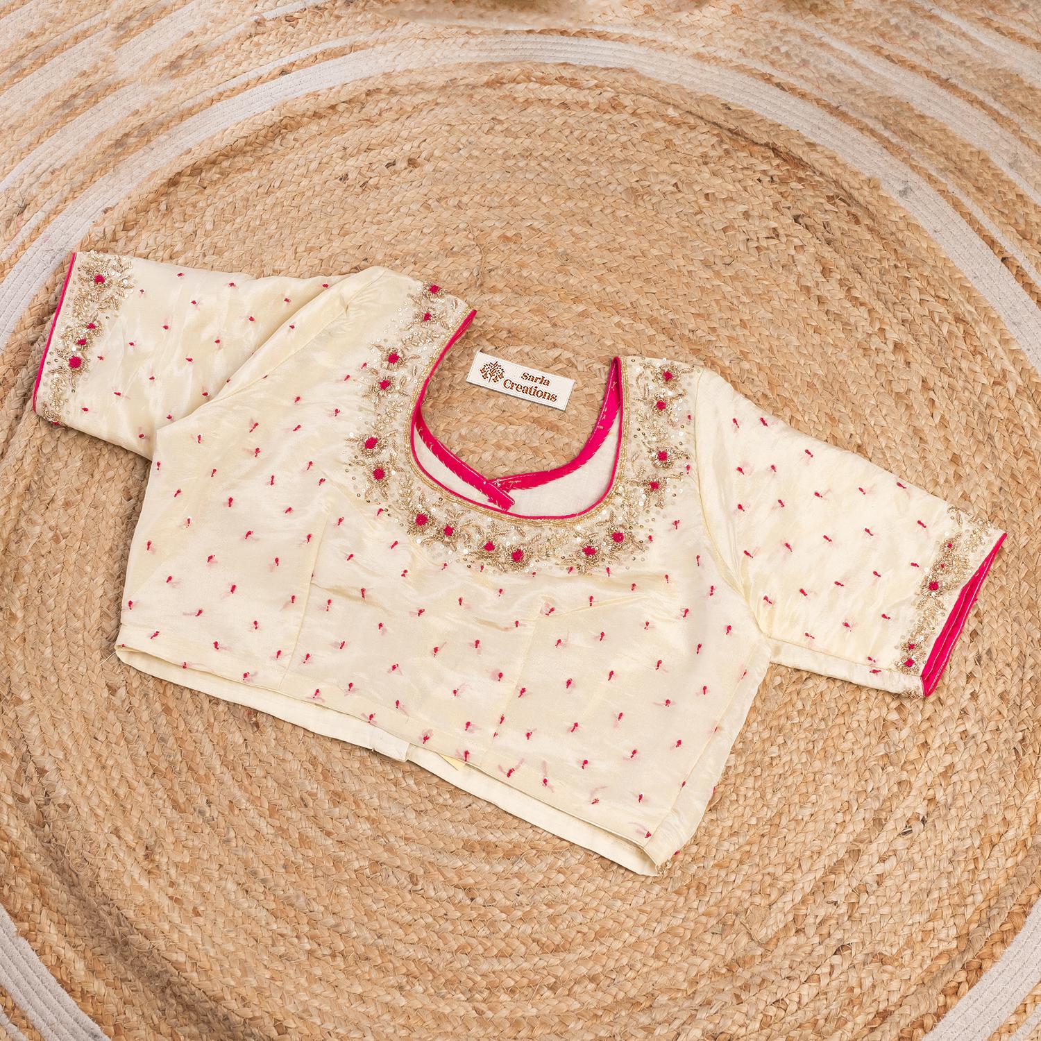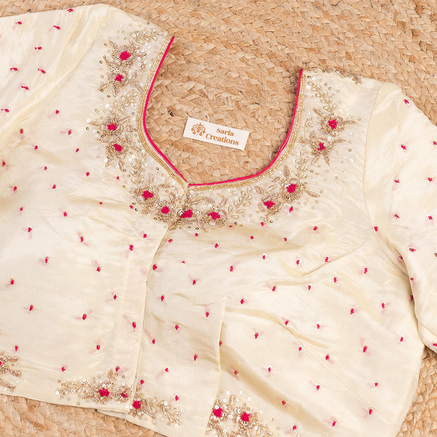 गुलाबी धागे की हाइलाइट के साथ ज़रदोज़ी हस्तकला में ऑफ व्हाइट टिशू ब्लाउज