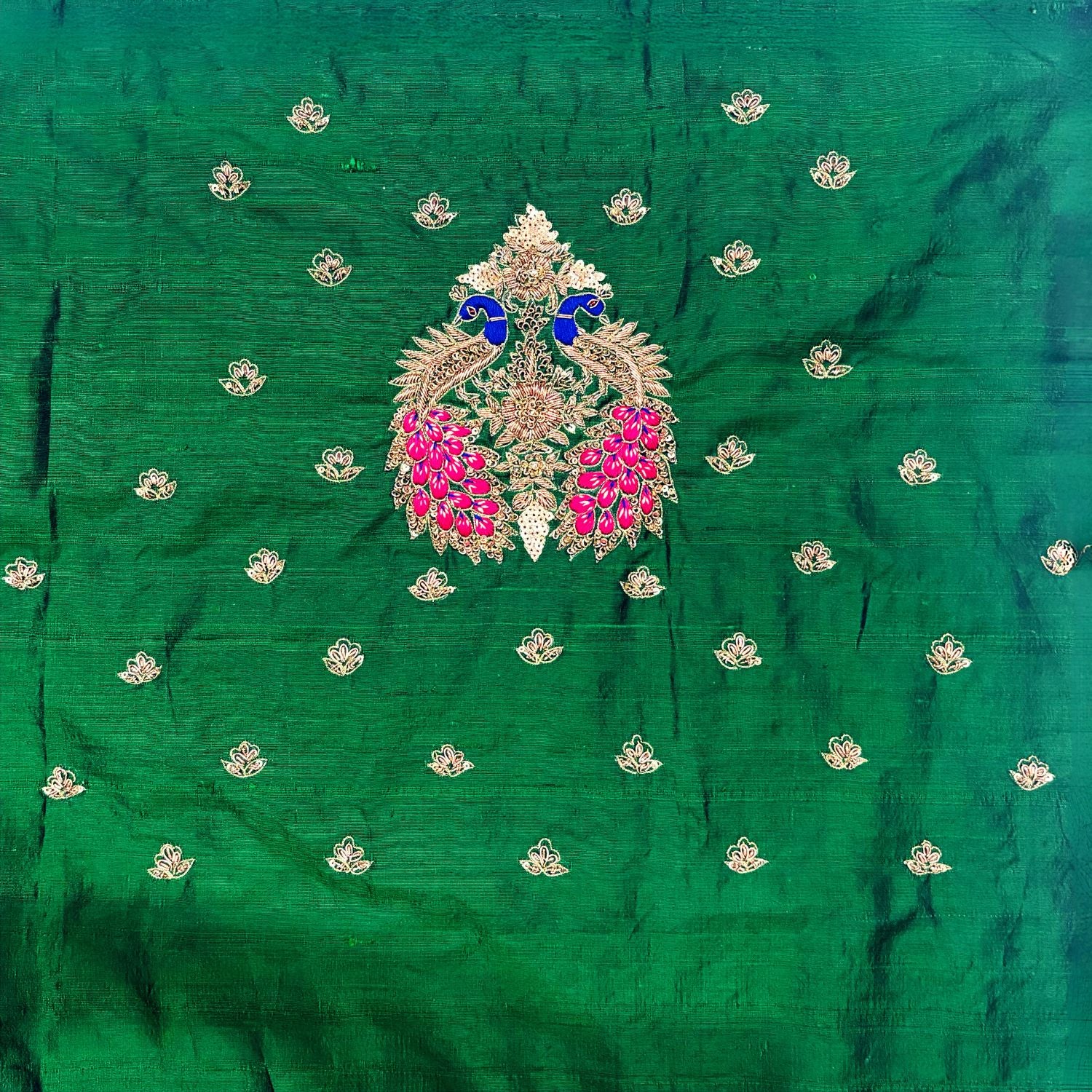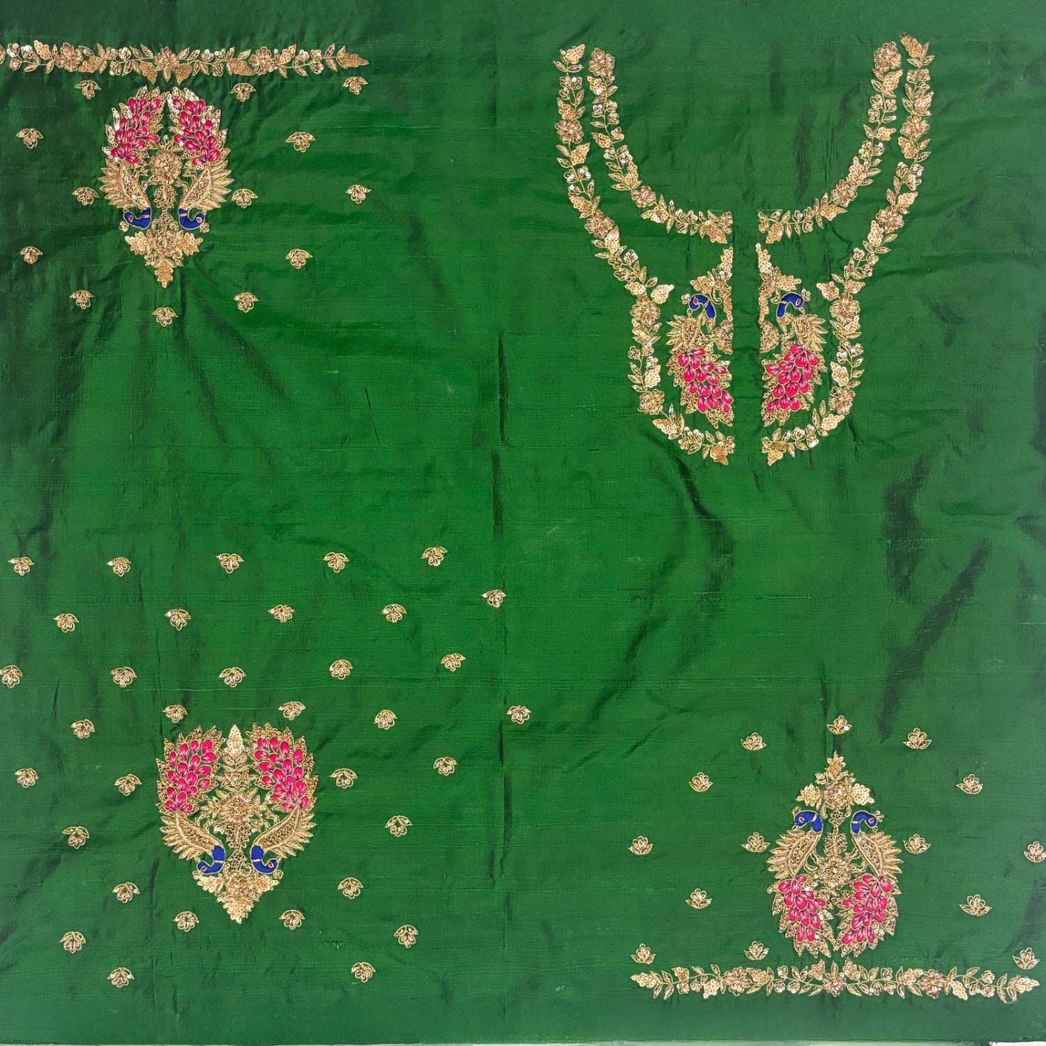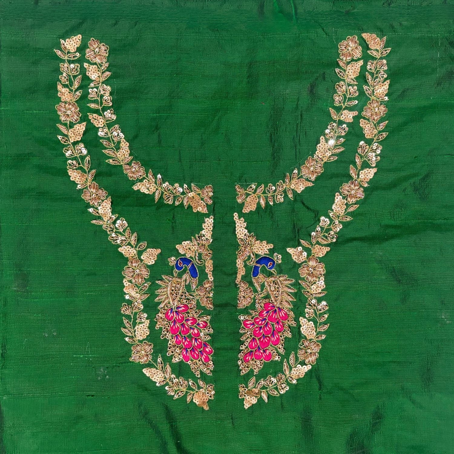 रेशमी कपड़े में जटिल आकृति रूपांकनों से सुसज्जित हरे रंग का जरदोजी हस्तशिल्प ब्लाउज पीस
