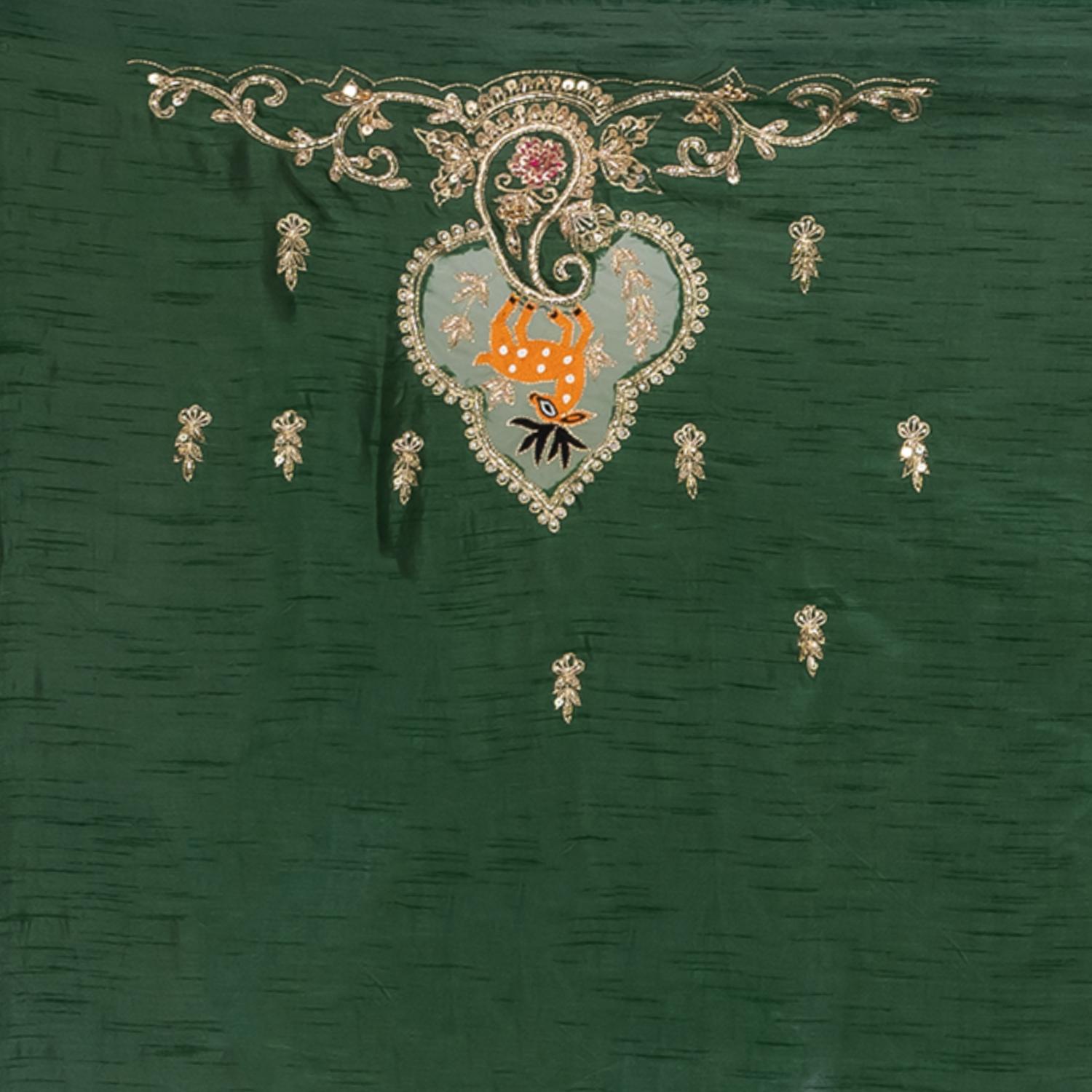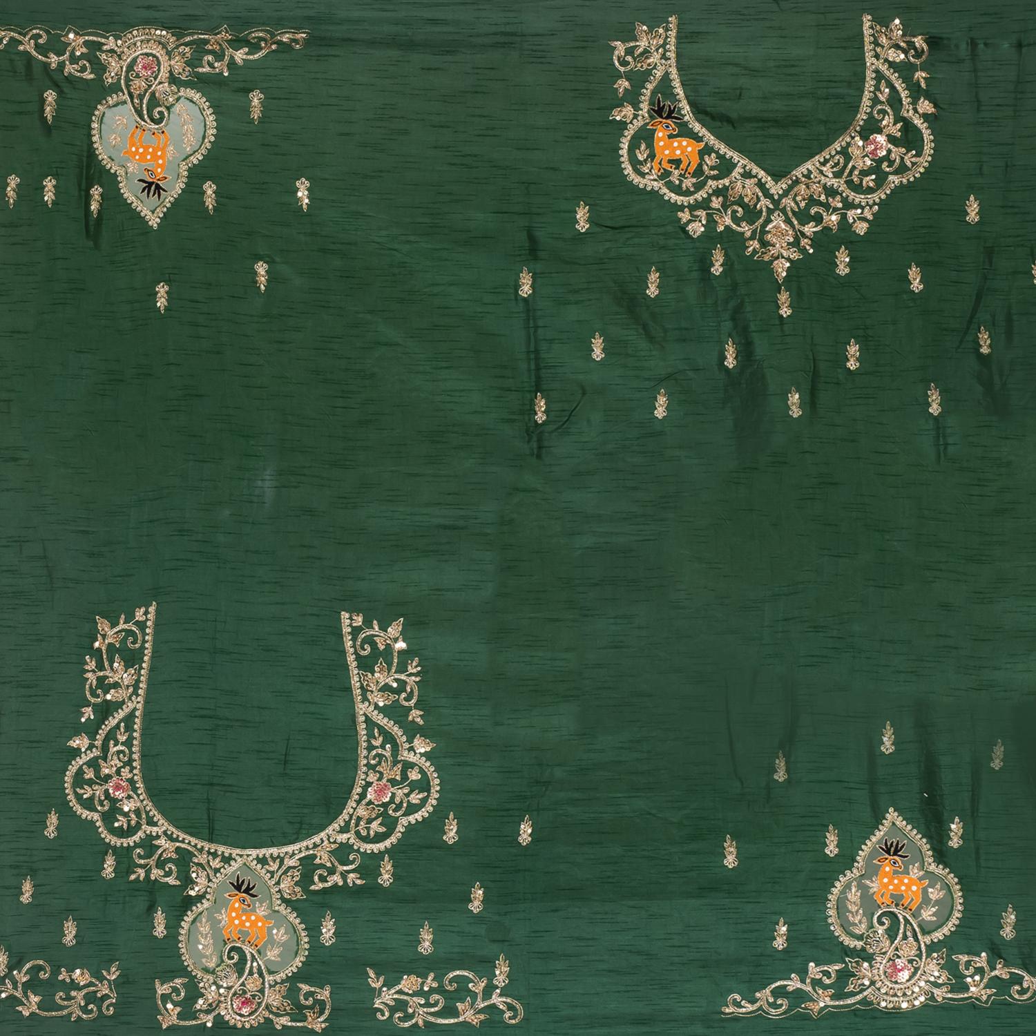 Green Zardozi blouse piece adorned with intricate figure motifs in Dola Silk