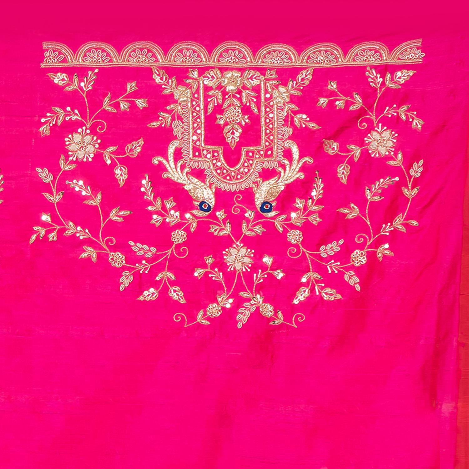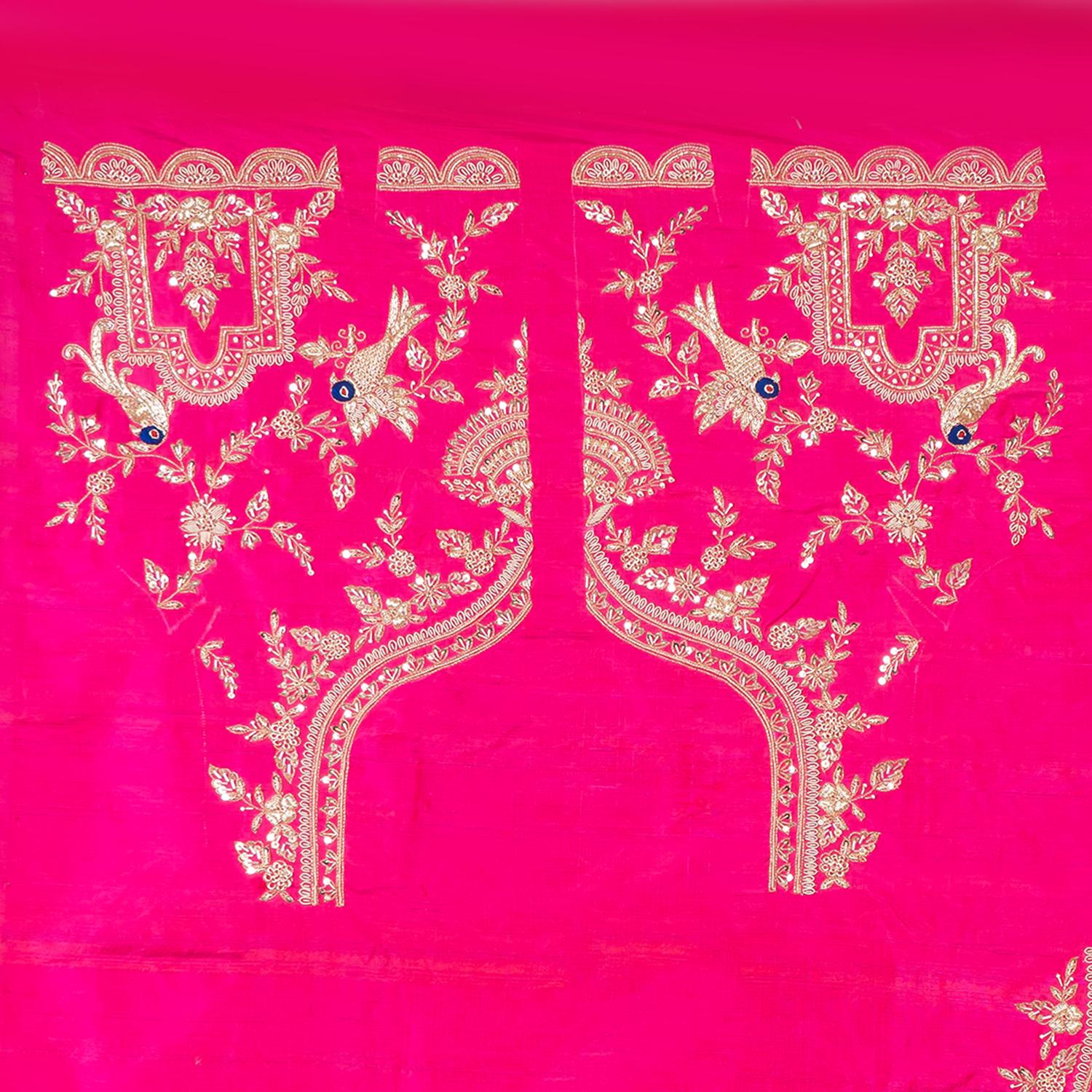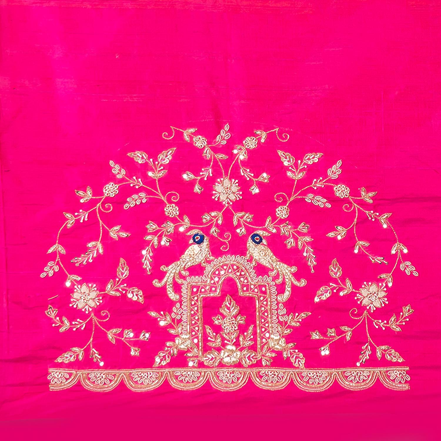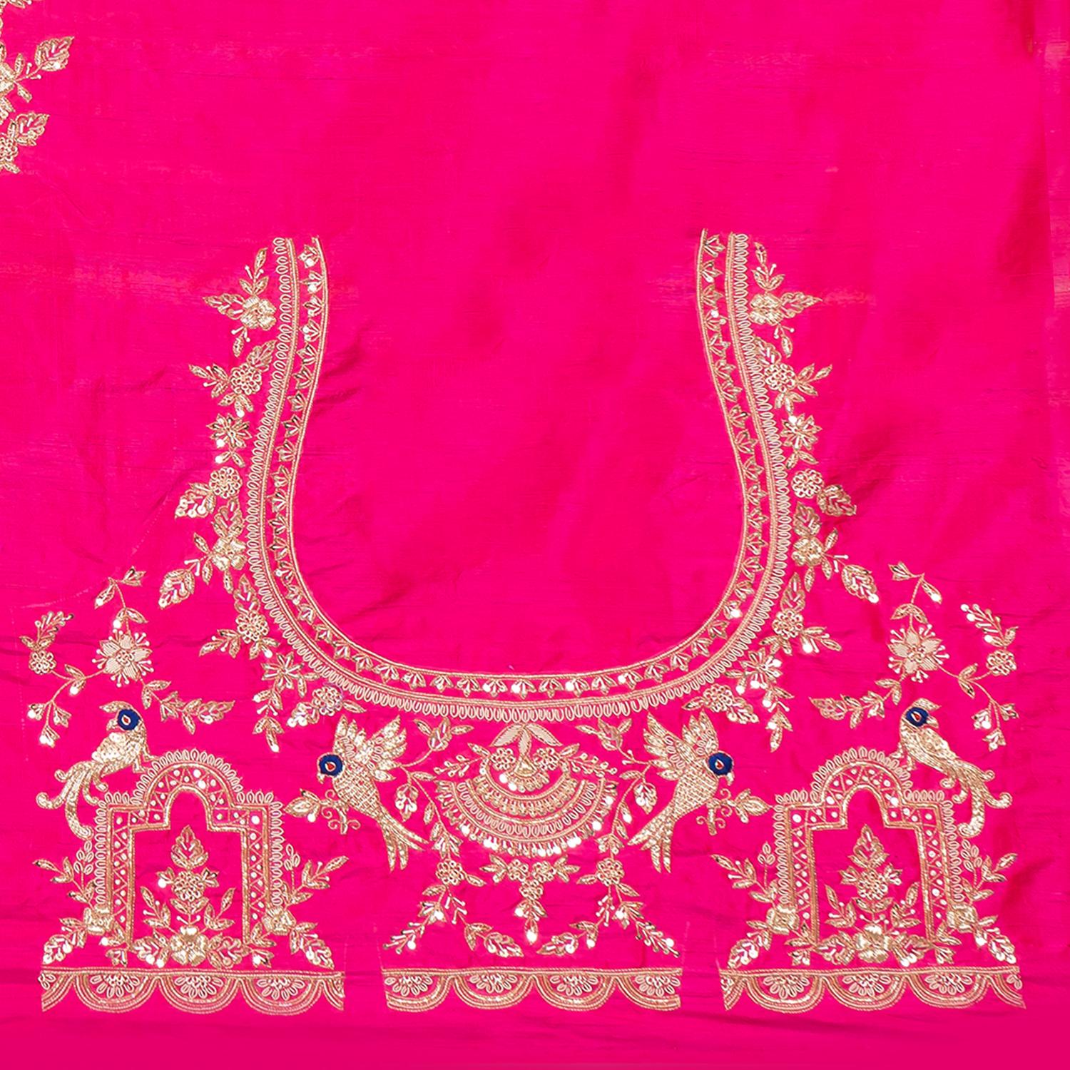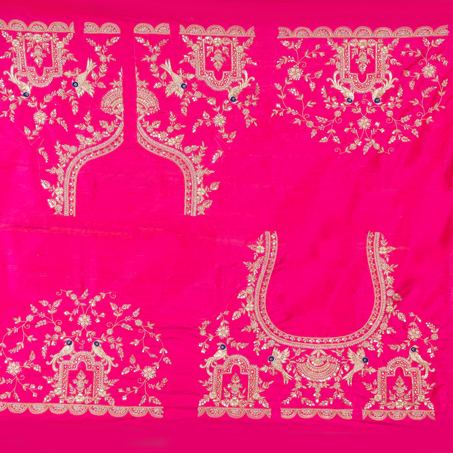 Pink Zardozi handwork blouse piece adorned with intricate figure motifs in Dola Silk