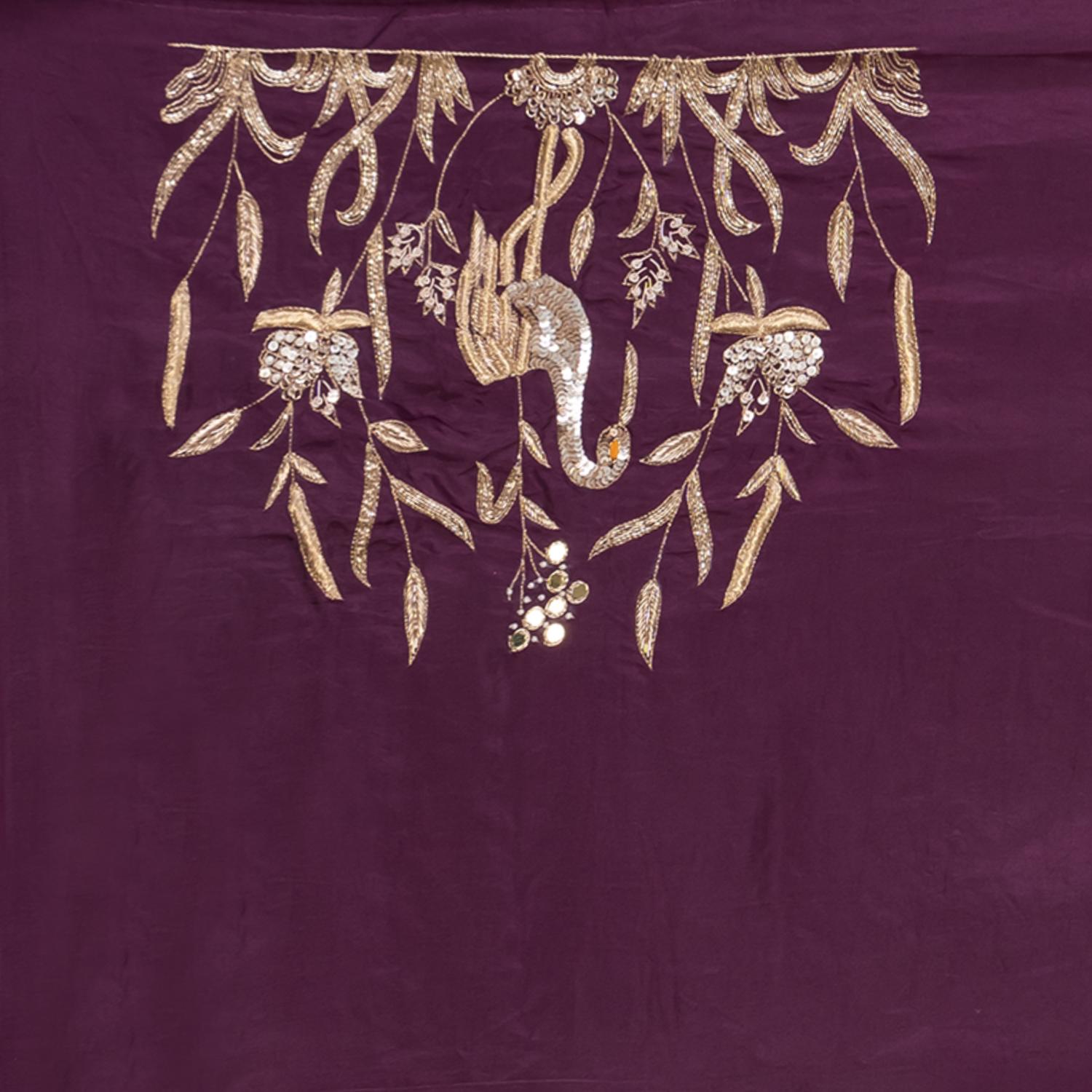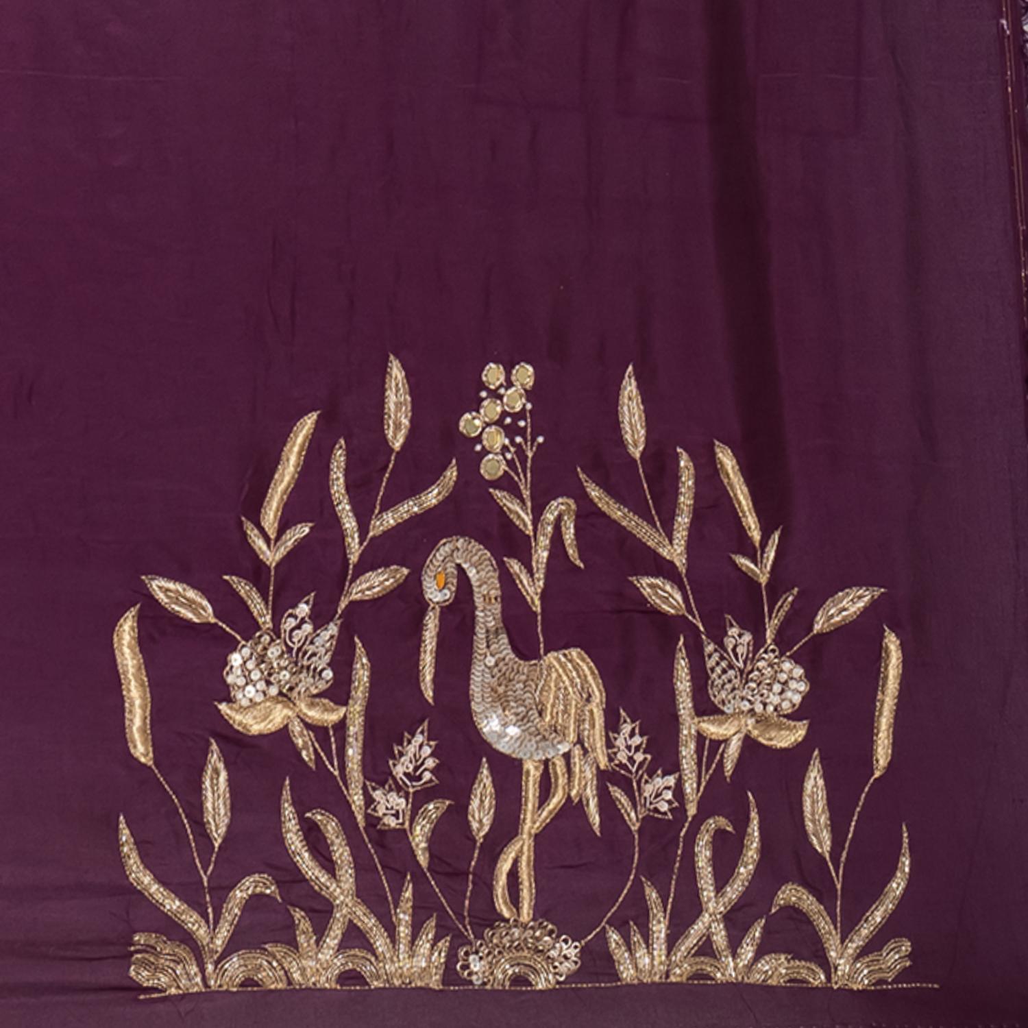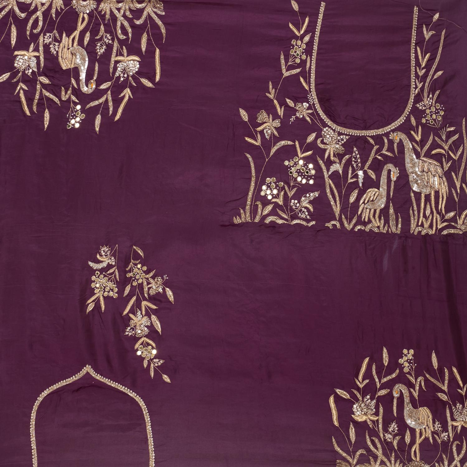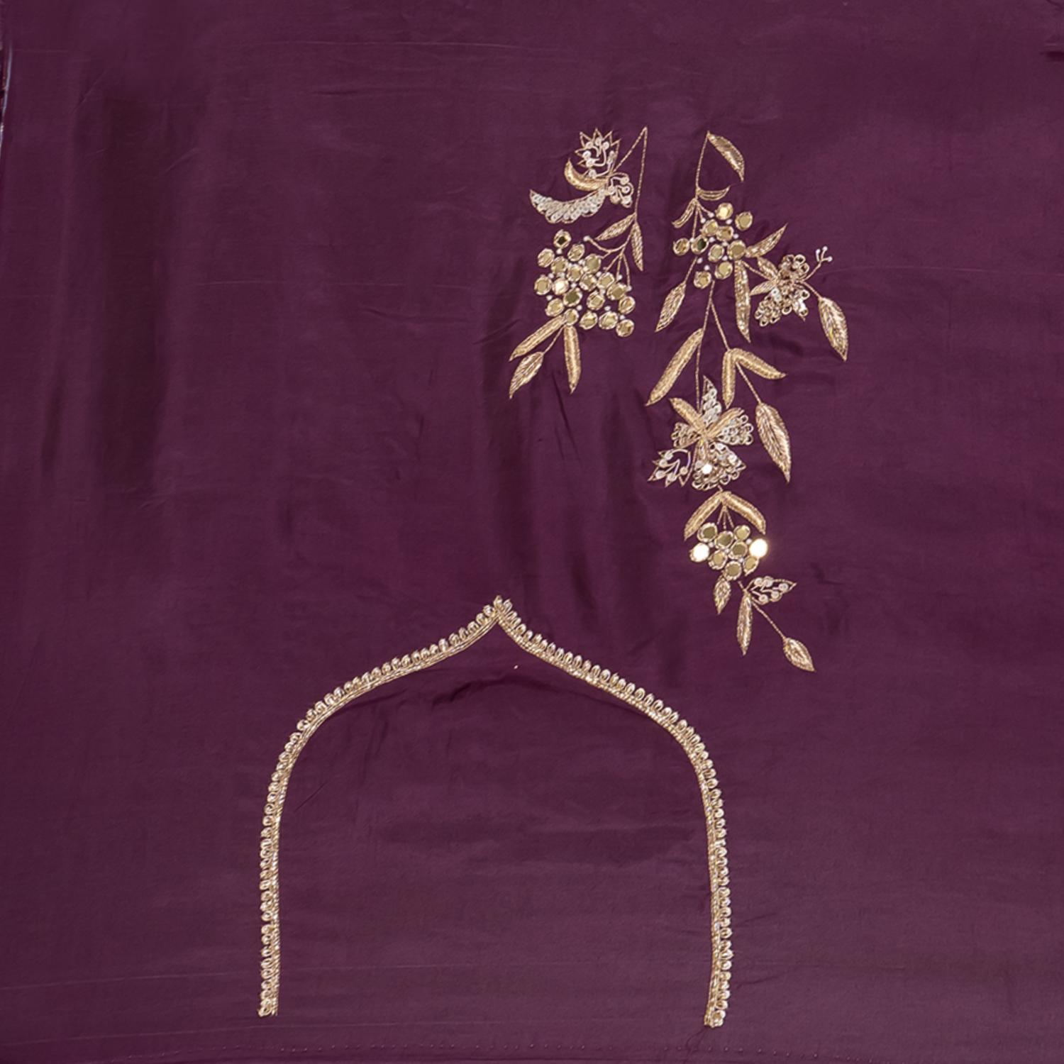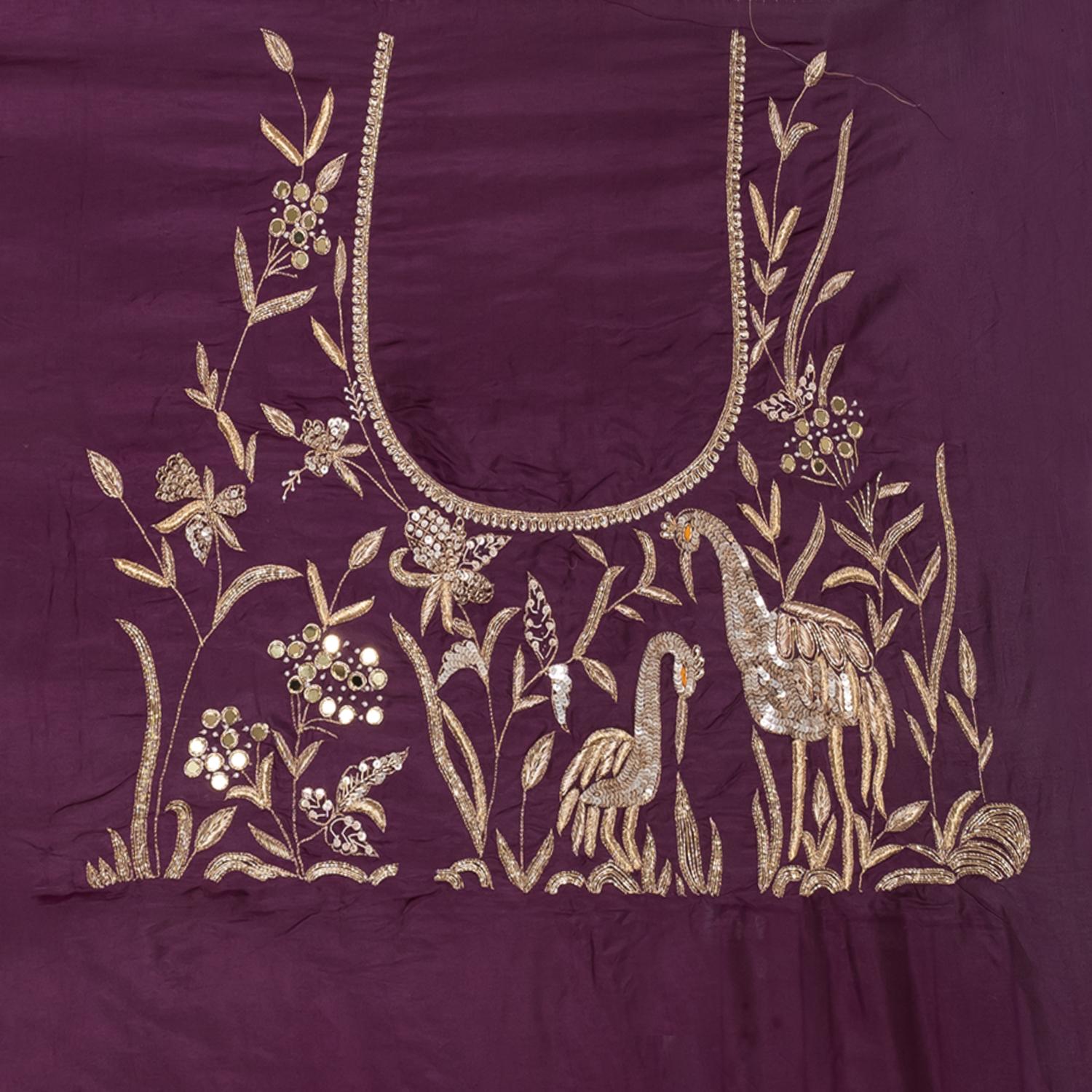 Dark Purple Zardozi handwork blouse piece adorned with intricate figure motifs in Dola Silk